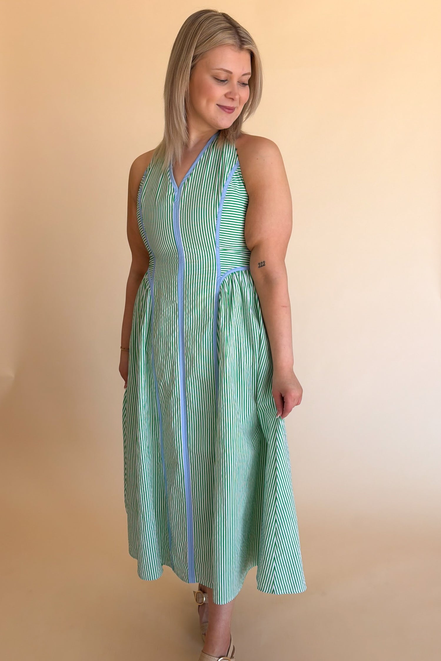 Striped halter midi dress featuring contrast binding detail. Self-tie halter neck. Smocked panel at back. Side pockets. Zipper at back. Lined.