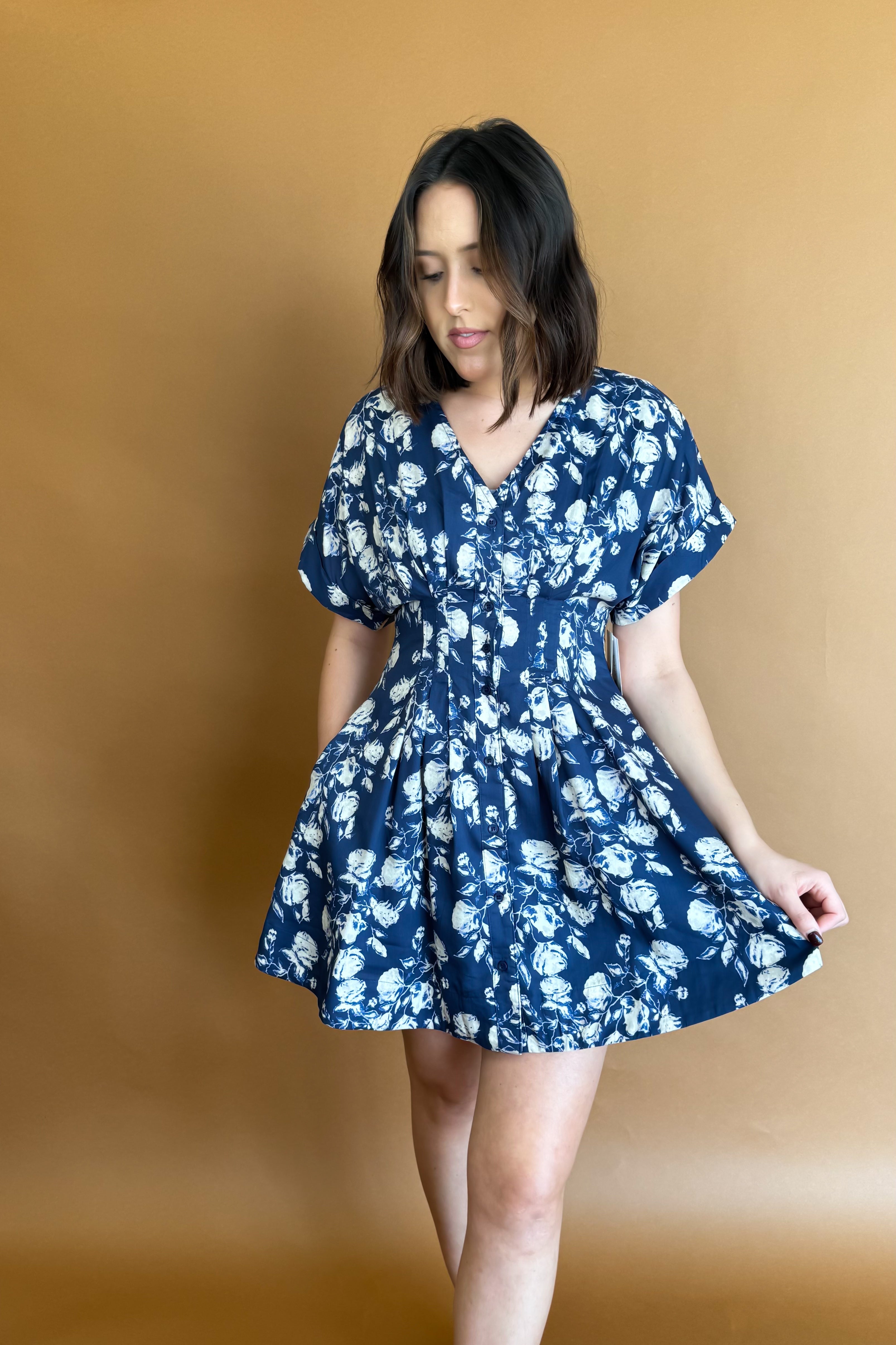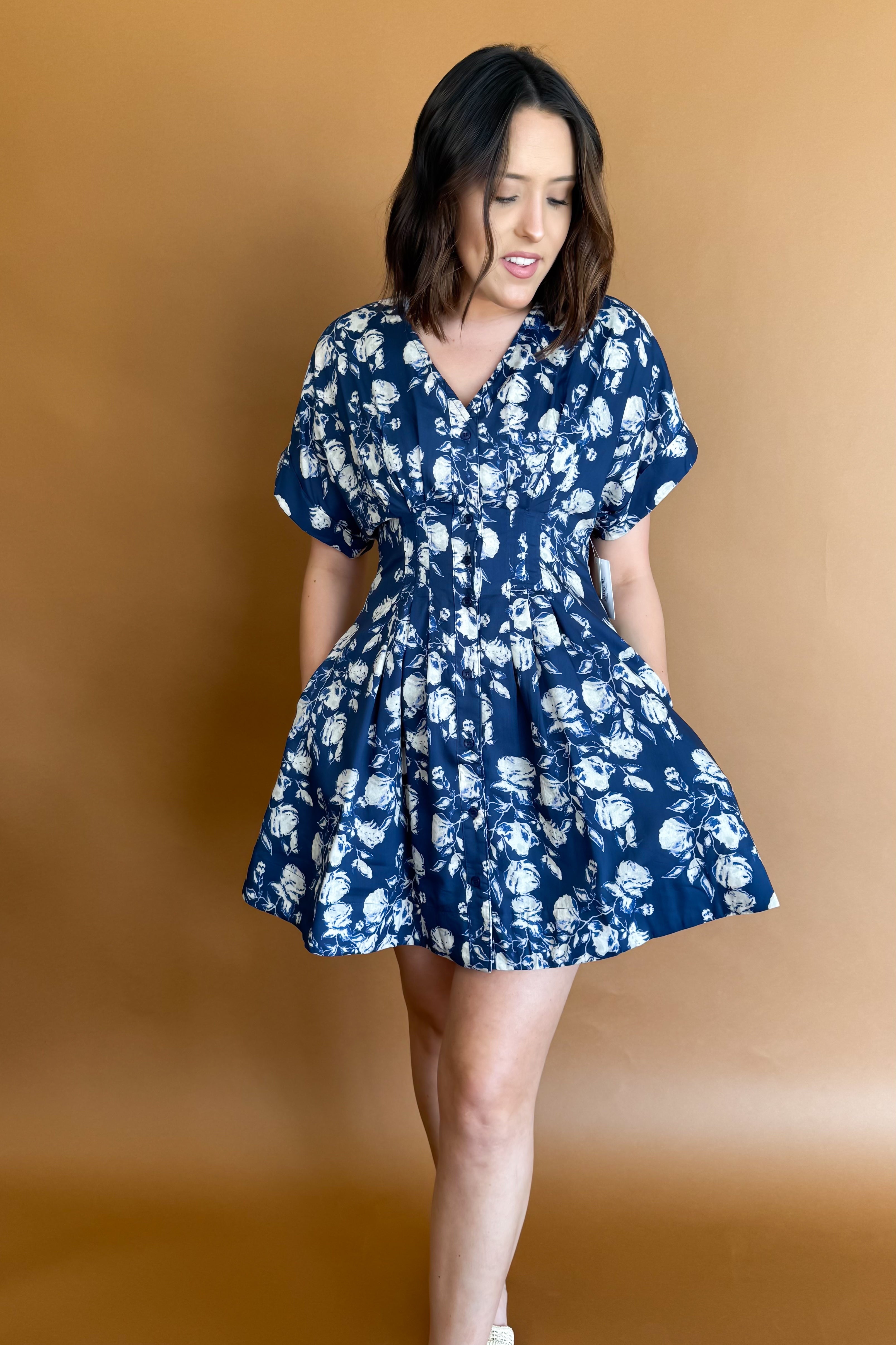 Floral print V-neck button front closure pleated mini flare dress. Side pockets.