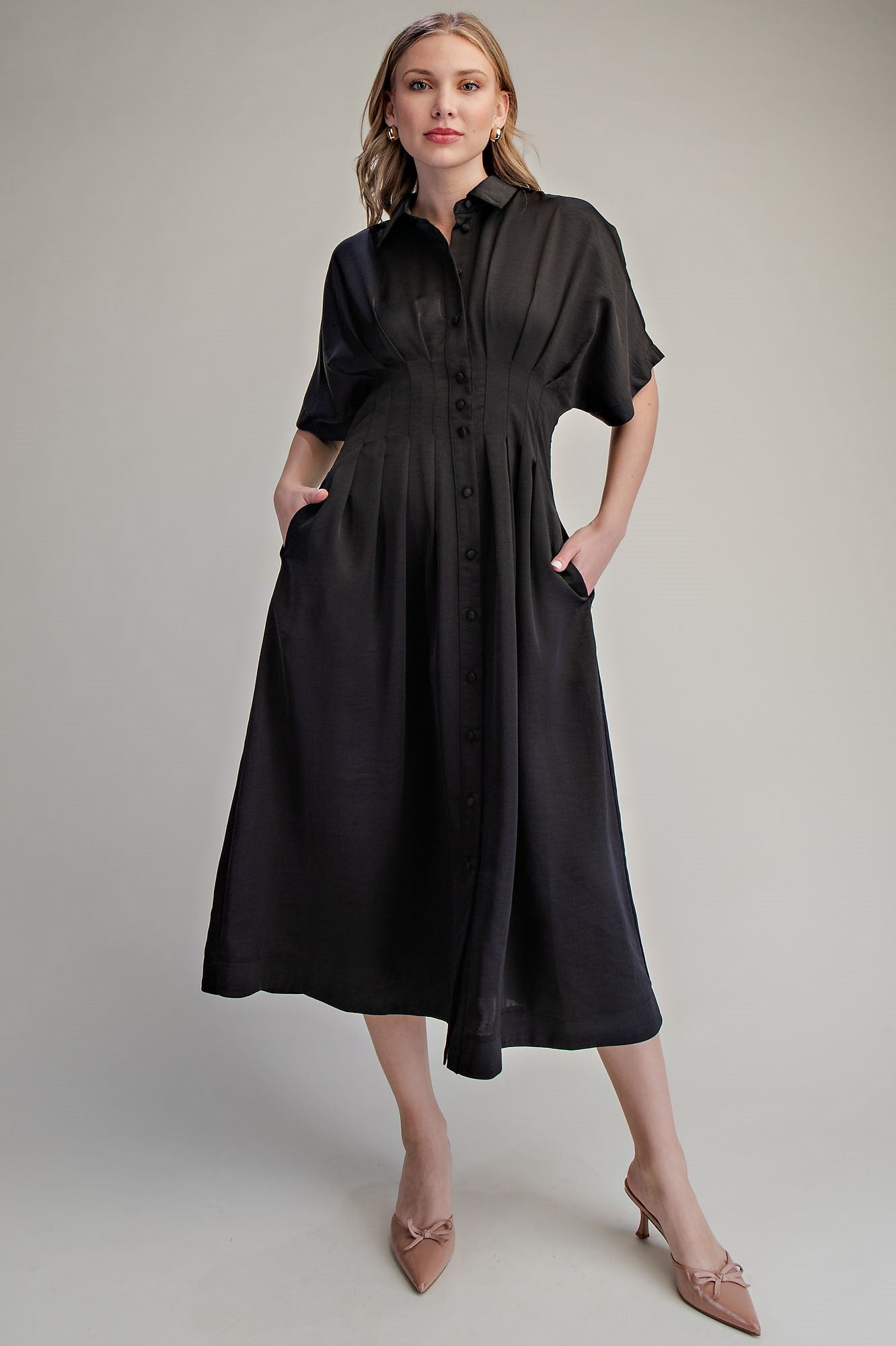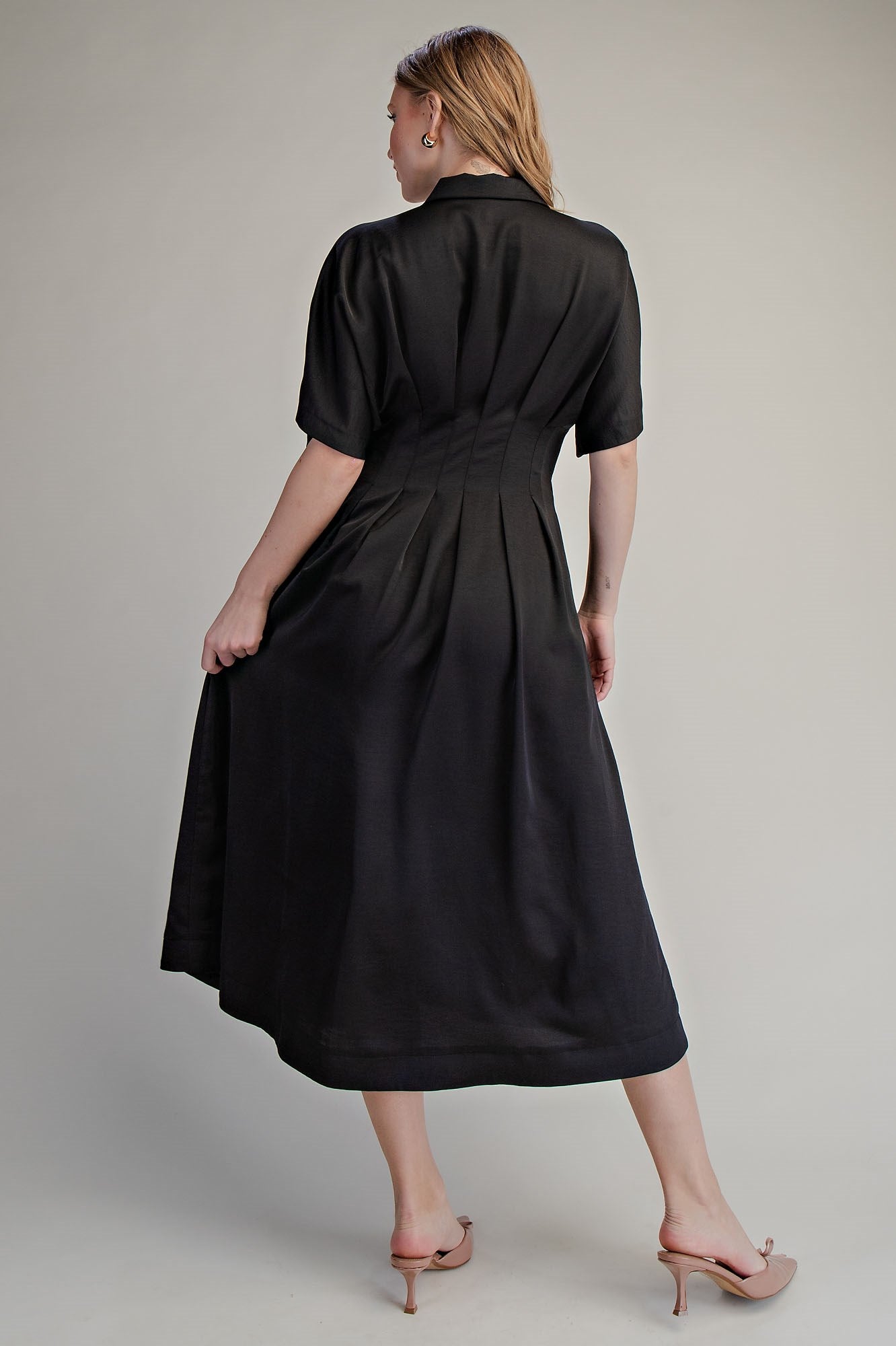 Collar Neck Pleated Waist Midi Dress