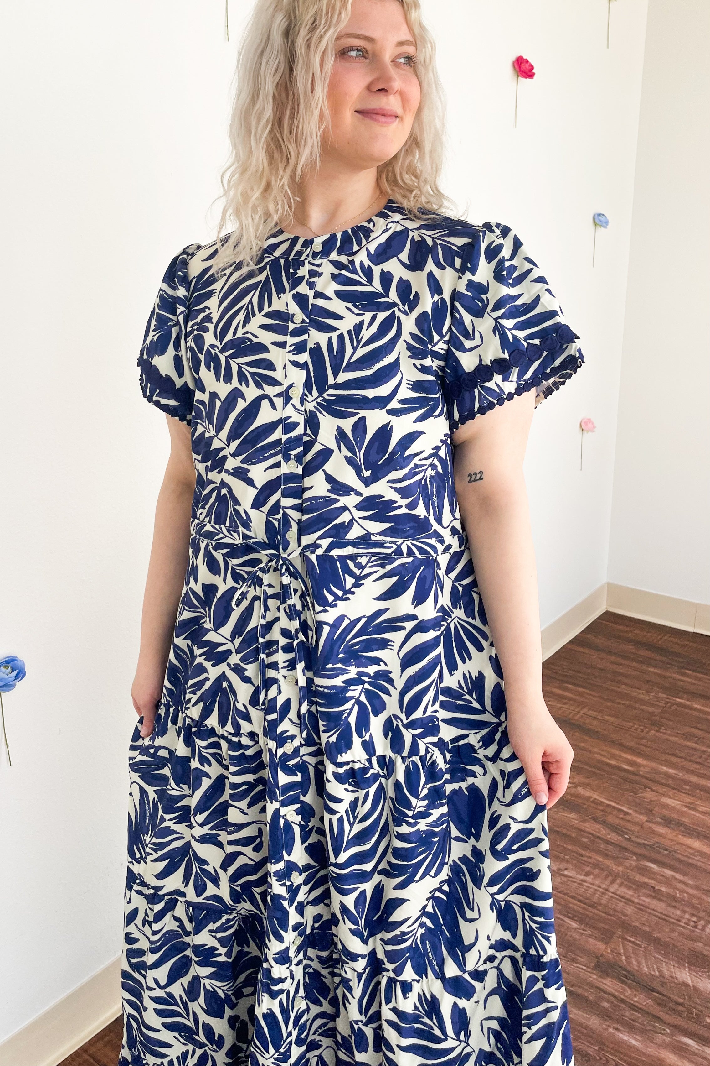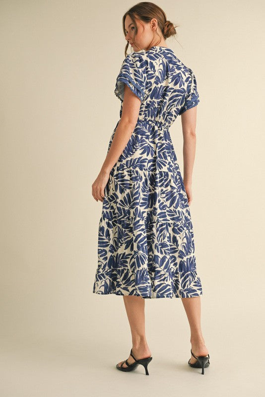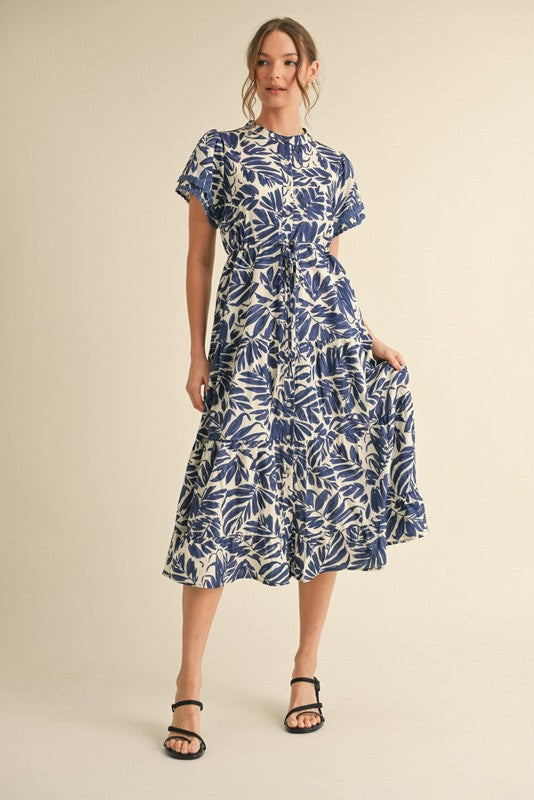 Print midi dress with U-neck, front buttoned closure, drawstring waistline,