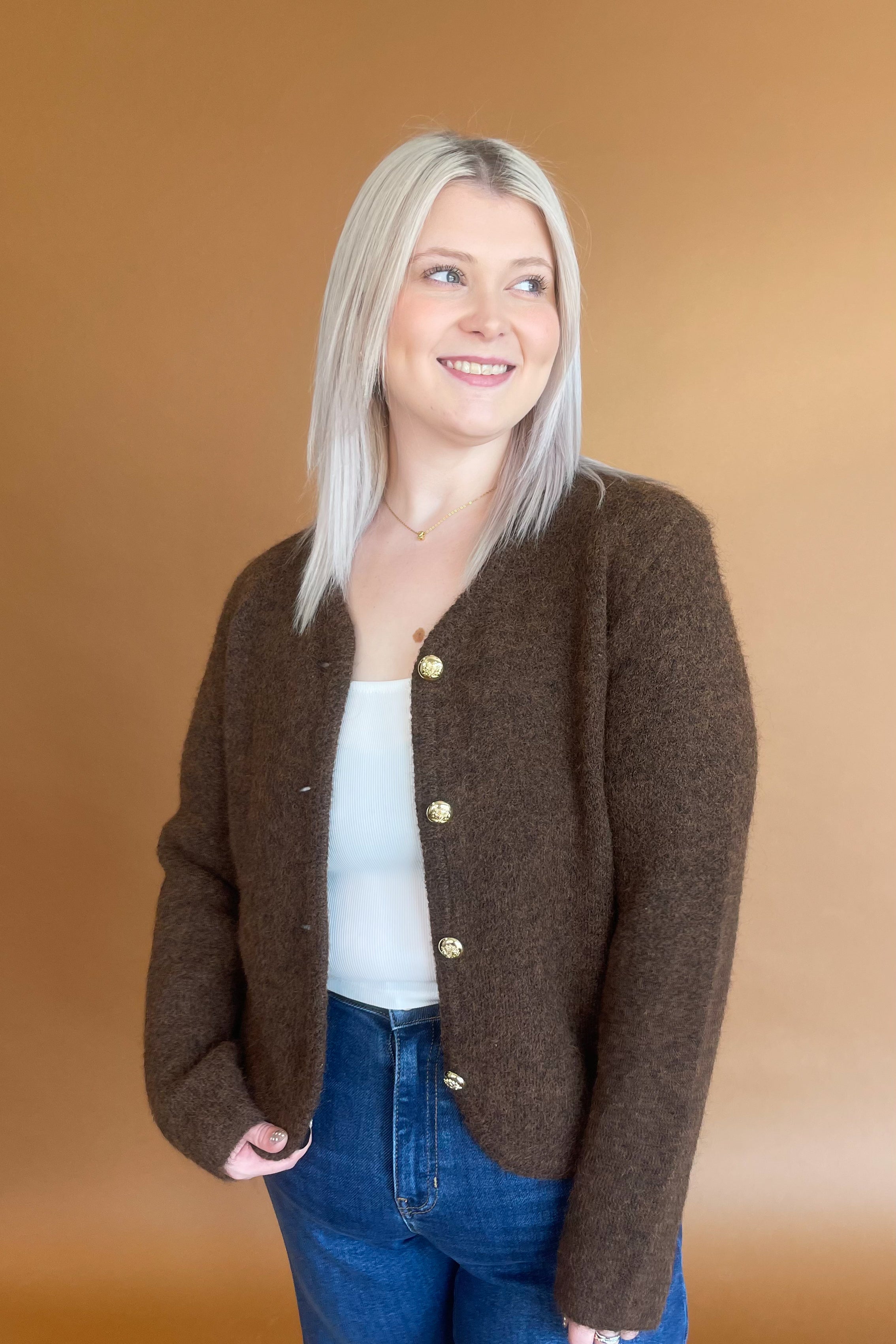 Button down cardigan jacket sweater in knit fabric. This soft knitted