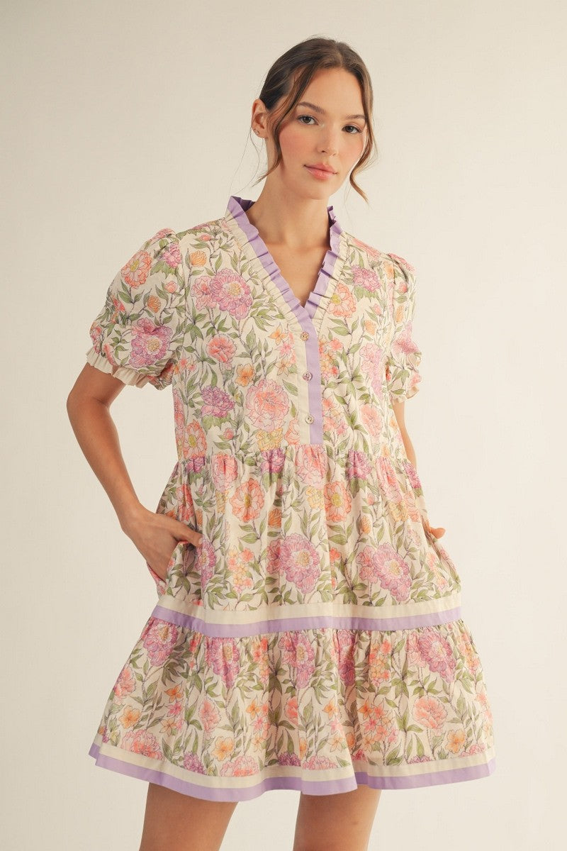 Short puff sleeves tiered floral babydoll dress with solid contrast,
