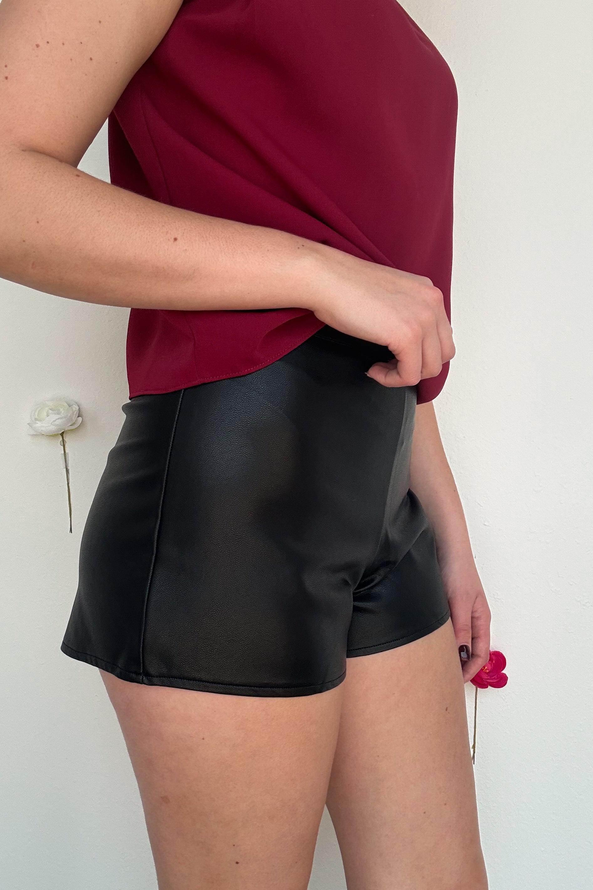 Our Susan Pu Shorts features a thigh length and a center back zipper closure