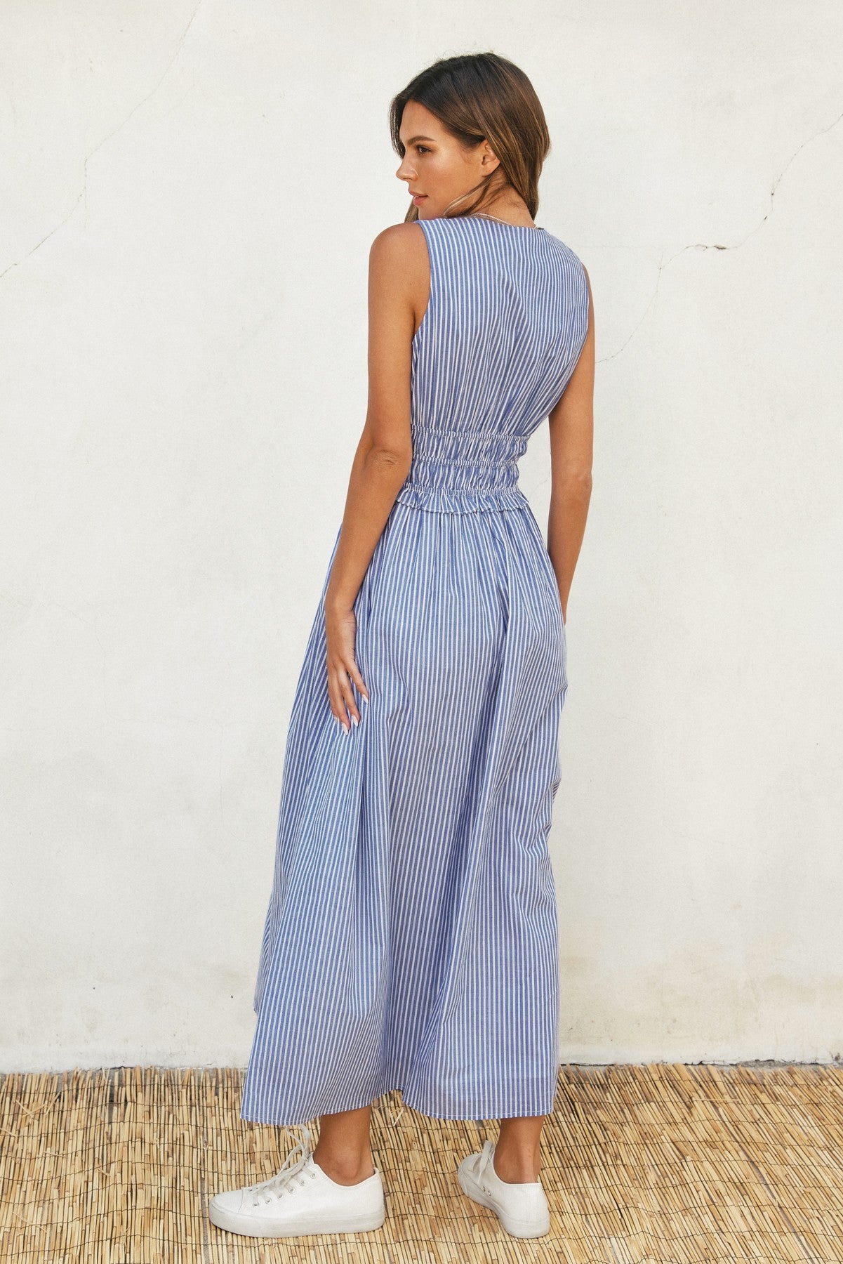 Striped cotton poplin midi dress featuring shirred underbust and wasit. Model is 5'8" and wearing size Small. - Plunging neckline with hook and eye closures - Sleeveless - Seamed underbust - Shirred waist with ruffle trim - Inseam side pockets - Hidden side zipper - Fit and flare - Fully lined Shell: 100% Cotton Lining: 80% Rayon, 20% Cotton