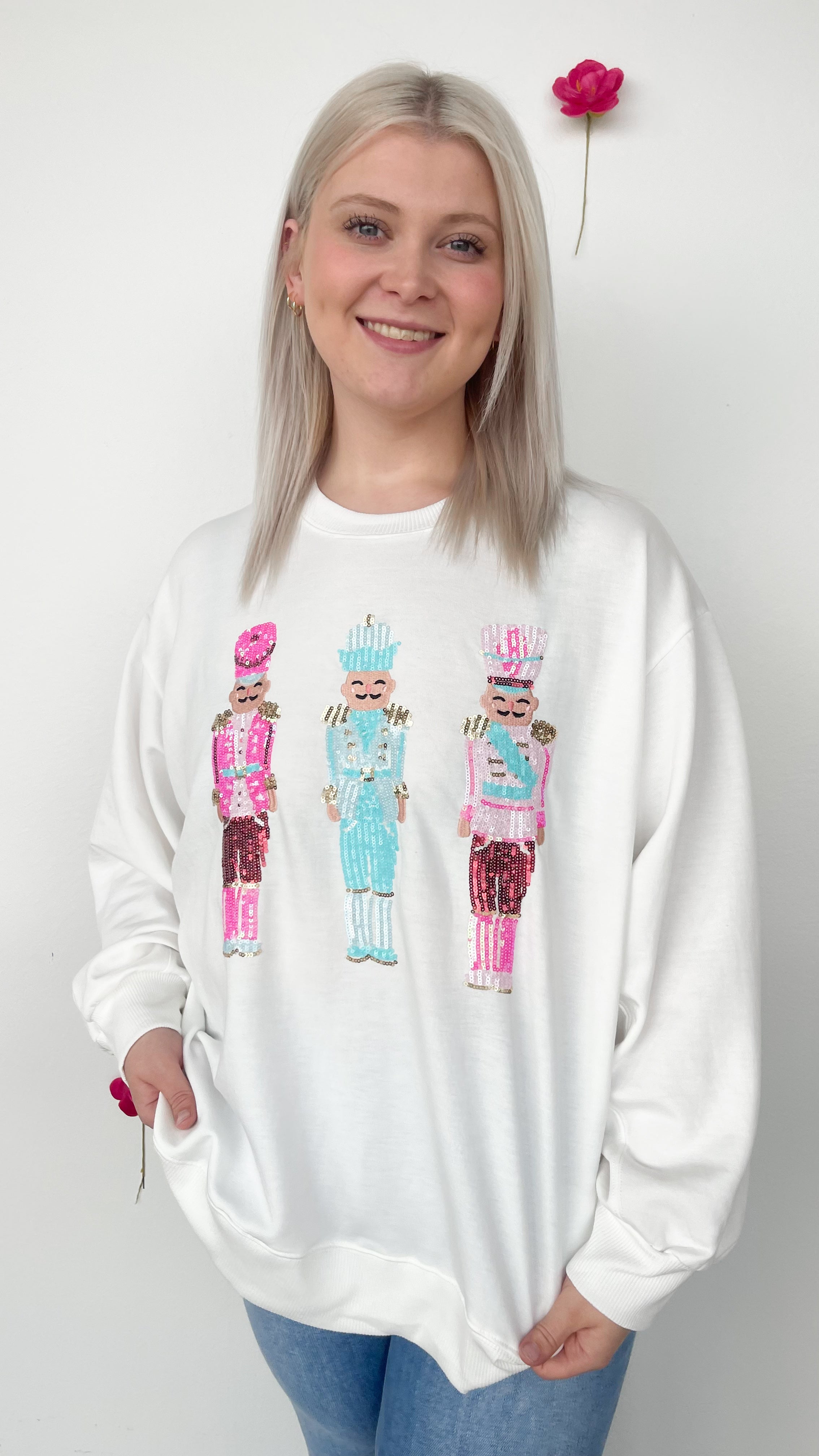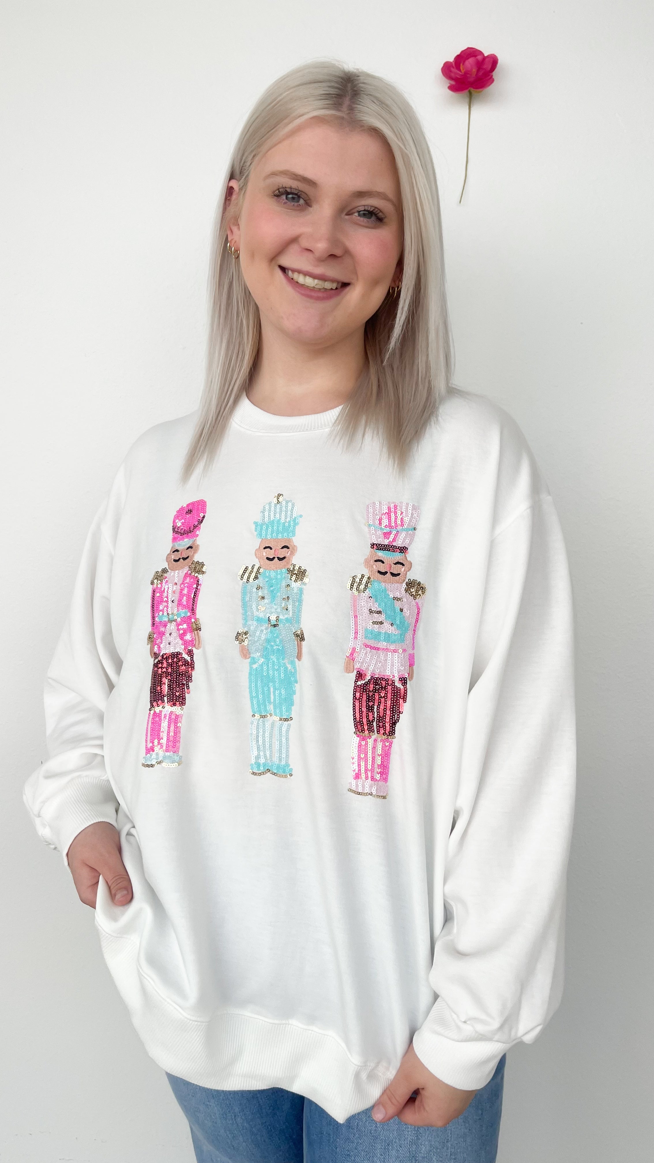 Isn't it so pretty! Elevate your seasonal wardrobe with the Three Nutcracker Sparkle Sweatshirt, crafted for refined comfort and festive elegance. This sweatshirt features a subtle shimmer design inspired by classic nutcracker figures, bringing a sophisticated charm to your casual attire. Soft, high-quality fabric ensures warmth and durability, making it perfect for cozy winter days or stylish holiday gatherings. Embrace understated festive style with this timeless piece that effortlessly blends comfort with a touch of sparkle.