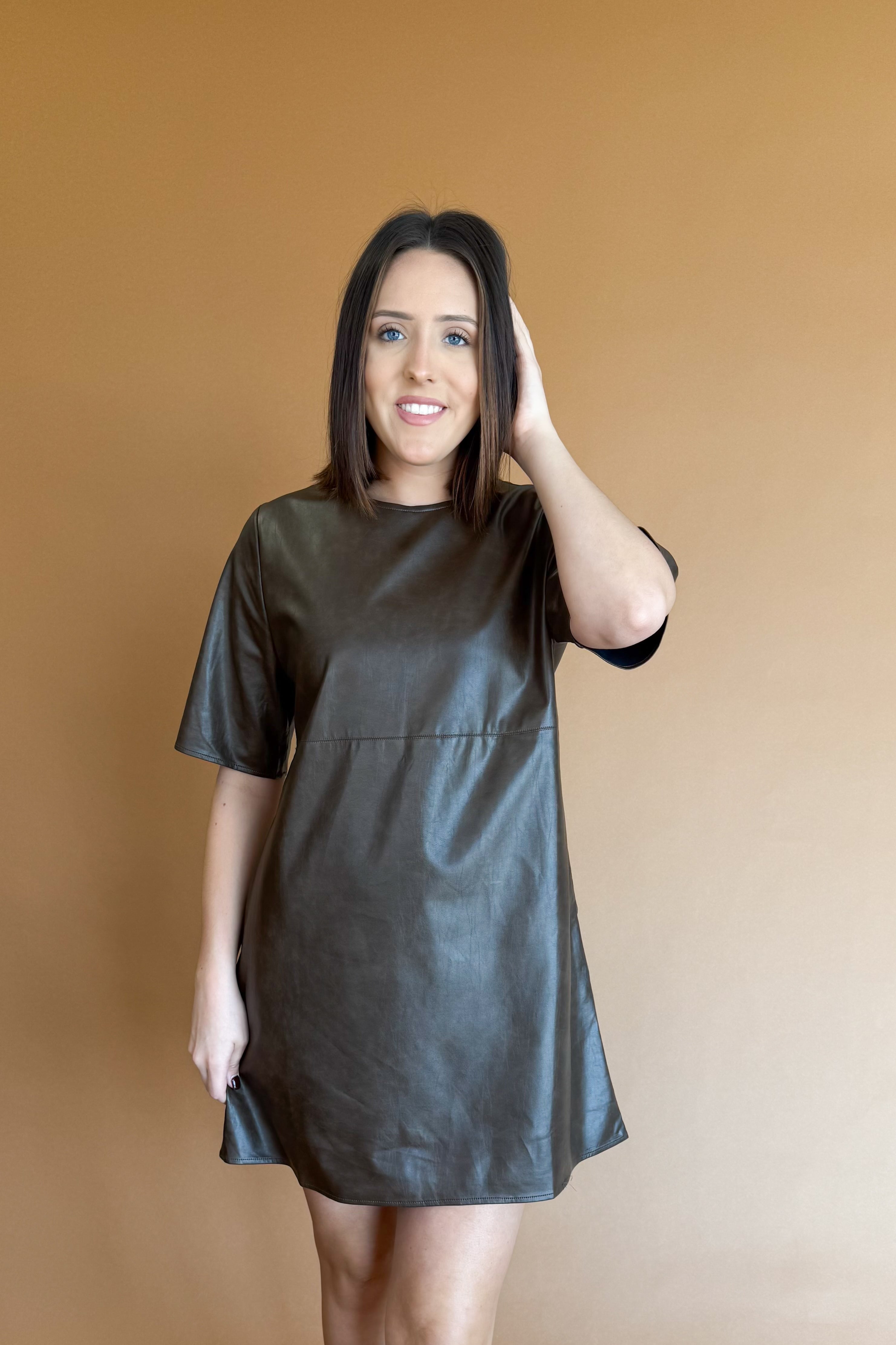 short sleeves faux leather A-line dress with side pocket, button closure