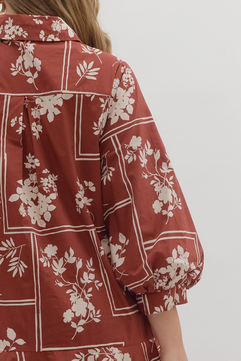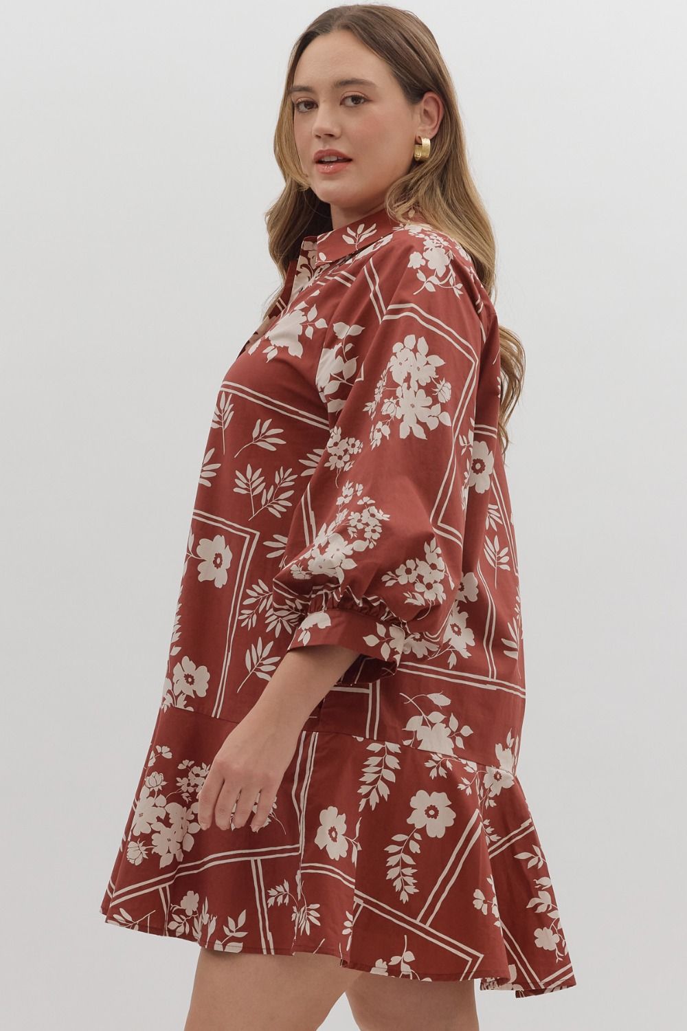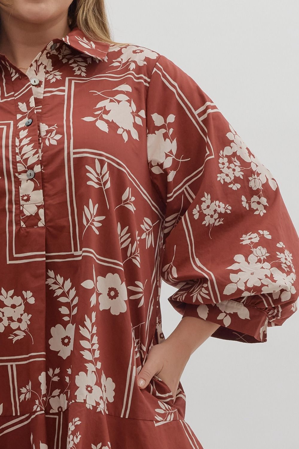 Botanical print ¾ sleeve mini dress featuring button closure at front. Side pockets. Lined.