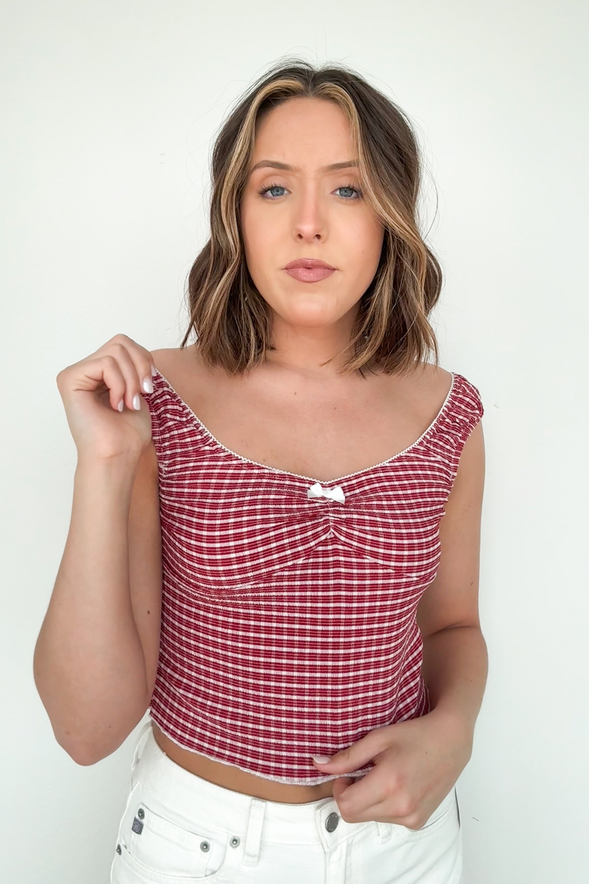 Stay chic and comfortable in this seersucker plaid top. Made from soft, breathable seersucker fabric, it features elasticized straps for a flexible fit. The dainty trim details add a touch of femininity and charm, making this top perfect for casual outings or relaxed weekends. Pair it with skirts, shorts, or jeans for an effortless, stylish look.