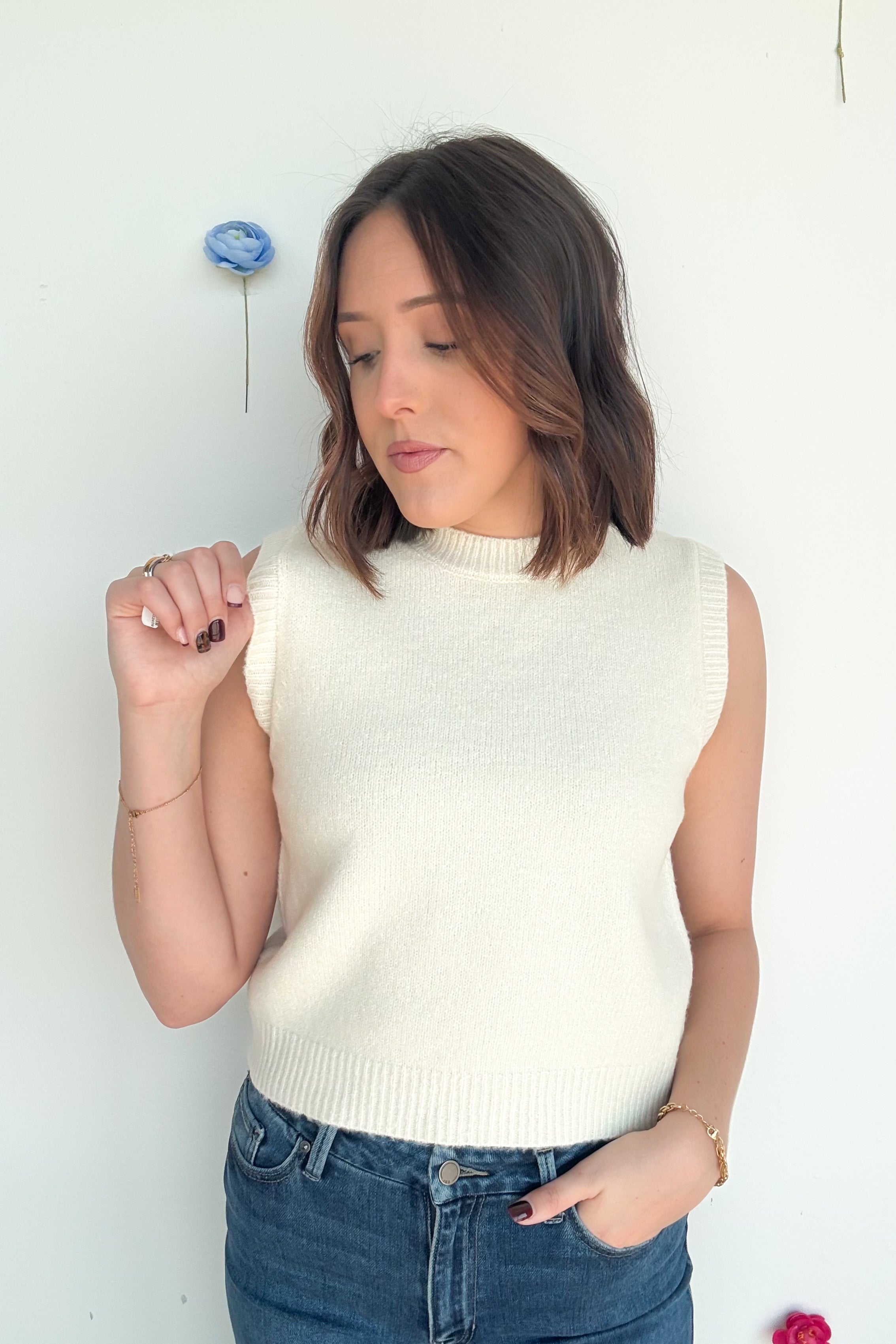 Elevate casual outings with this sleeveless structured crew neck knit. Its classic design ensures it never goes out of style. Perfect for layering, it pairs beautifully with denim for a chic daytime look. Ideal for weekend getaways. Style it with bold accessories for added flair. 64% Acrylic 30% Polyester 6% Spandex