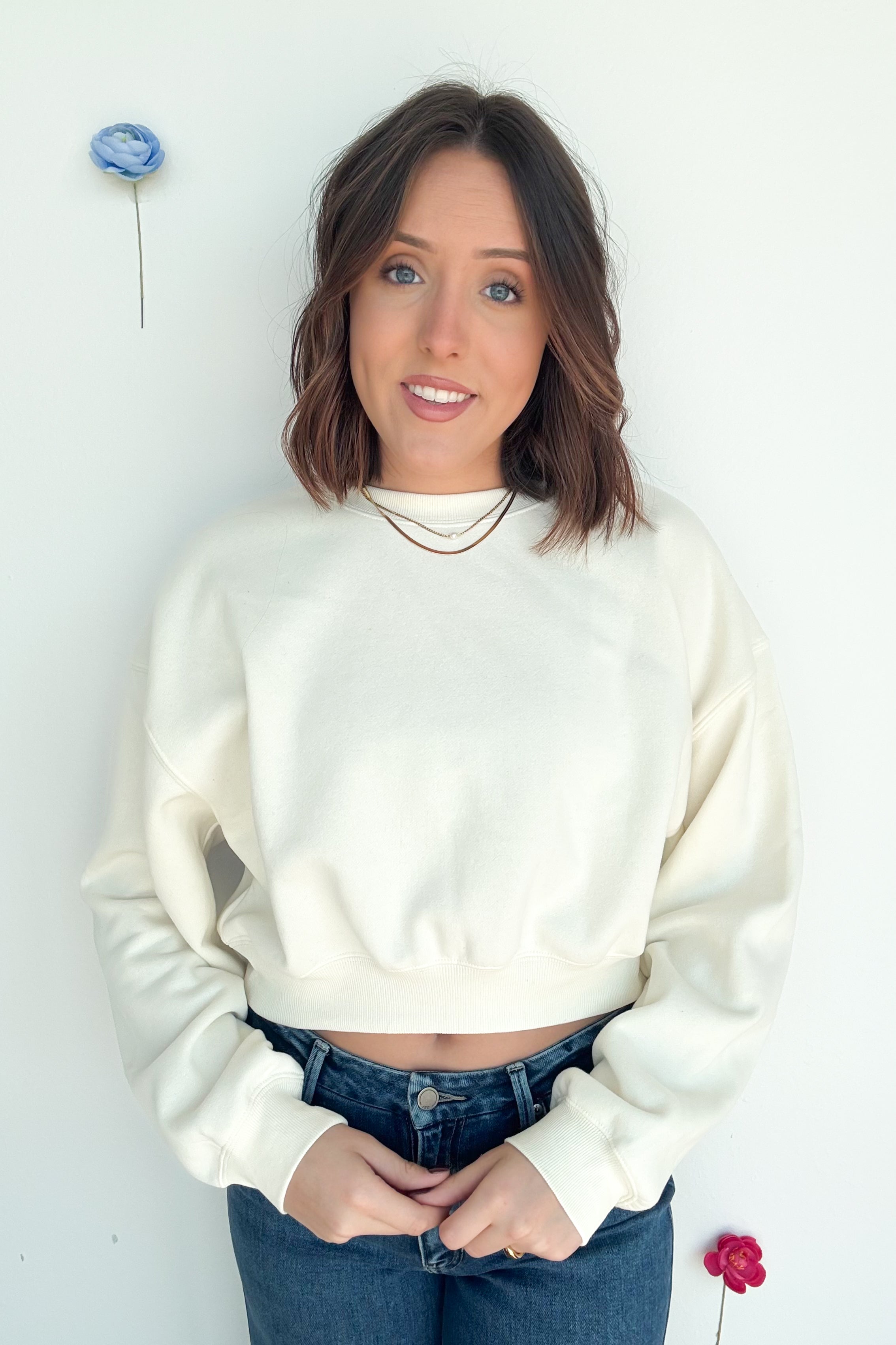 This sweatshirt paired with some jeans makes a cute fall outfit. The pullover style bodice comes with a crew neckline, long sleeves and drop shoulders. The relaxed silhouette ends in a banded hem, making it perfect to throw on when you are on the go. 60% cotton 40% polyester