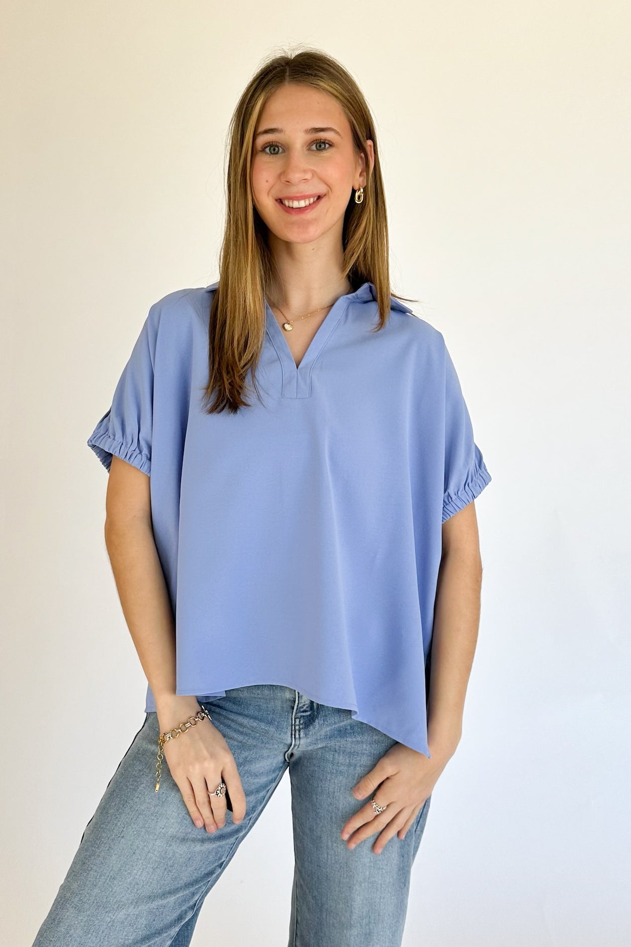 Solid short sleeve split collar side slit hem top. Unlined. Woven. Non-sheer. Lightweight. 100% polyester