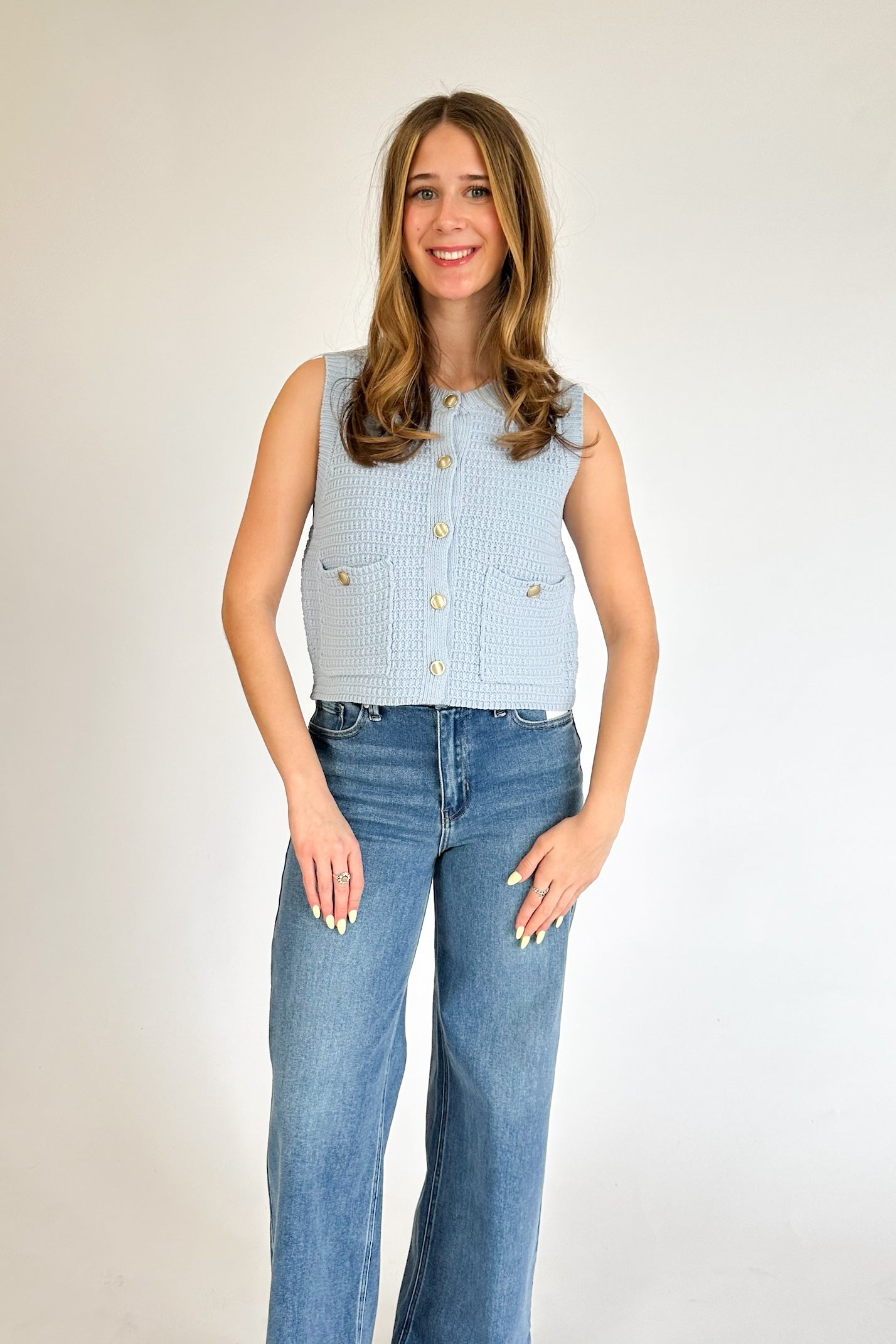 This textured sleeveless knit vest features a ribbed crew neckline and a