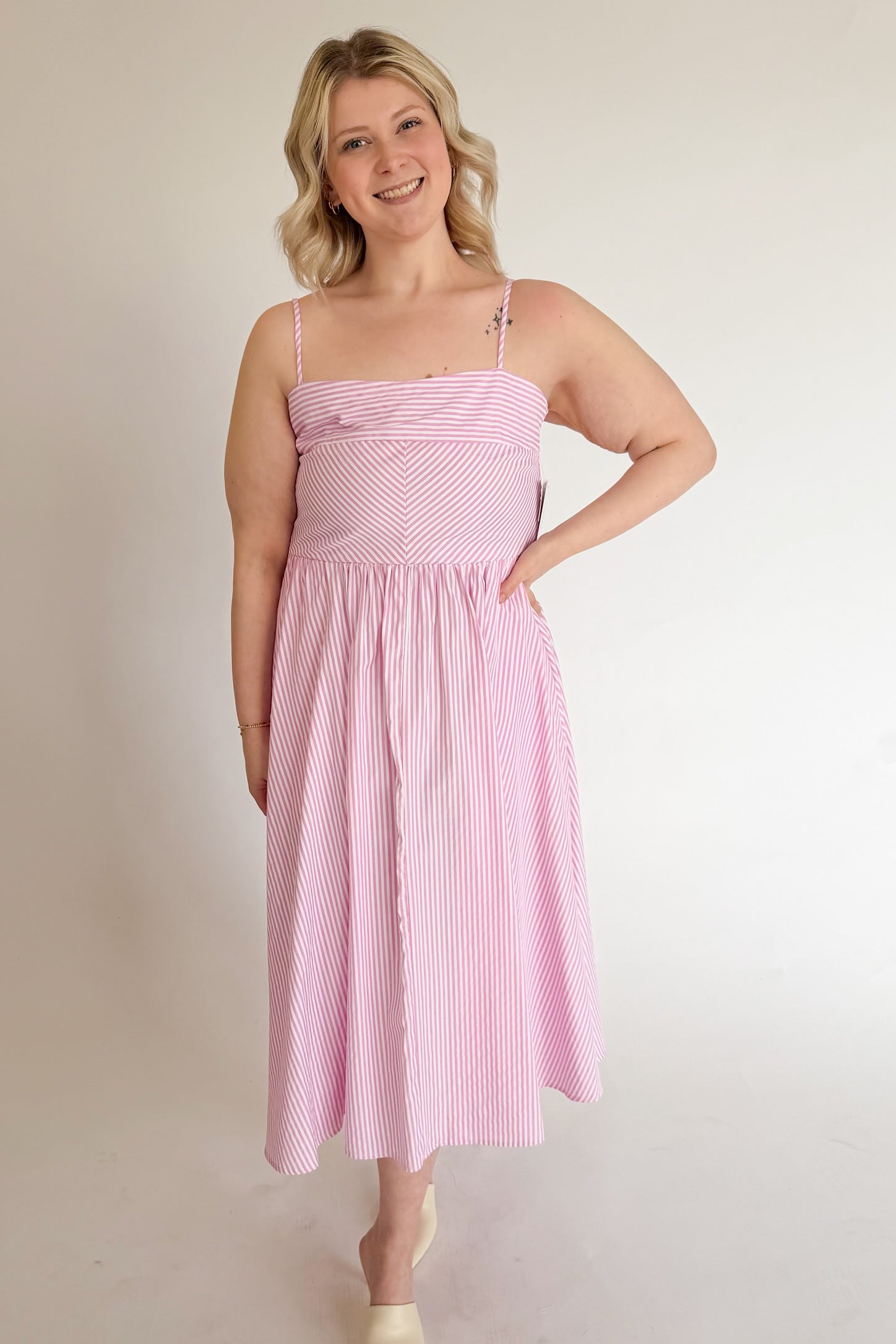 A charming striped dress featuring spaghetti straps and a fitted bodice