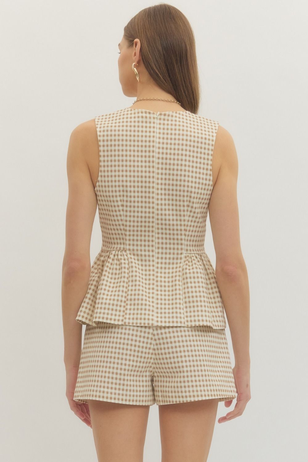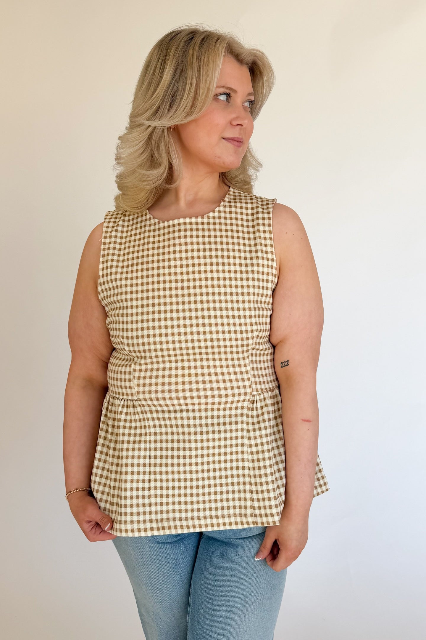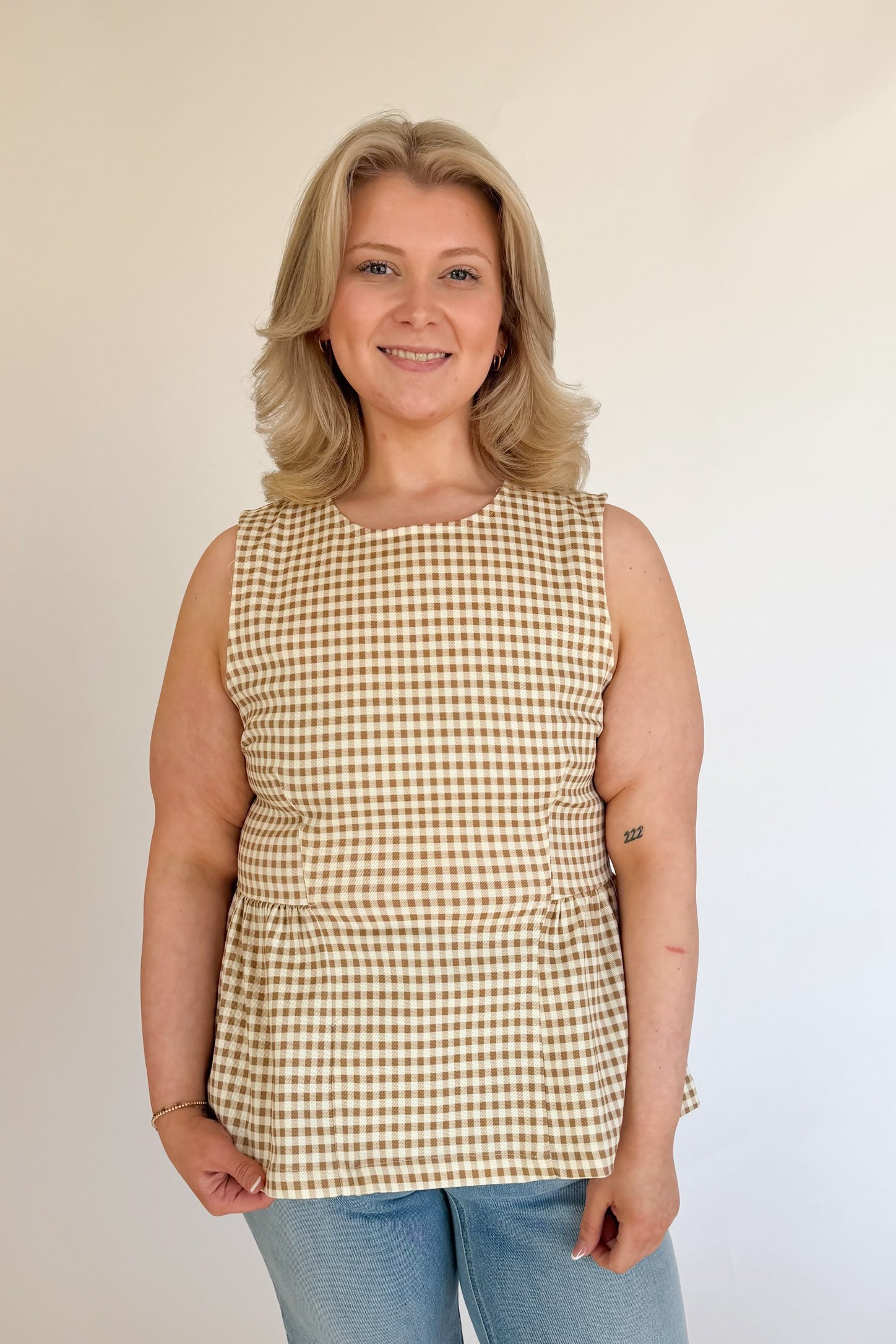 Gingham sleeveless peplum top featuring structured waist seam. Back zipper closure. Unlined. Woven. Non-sheer. Lightweight. 97% cotton, 3% spandex